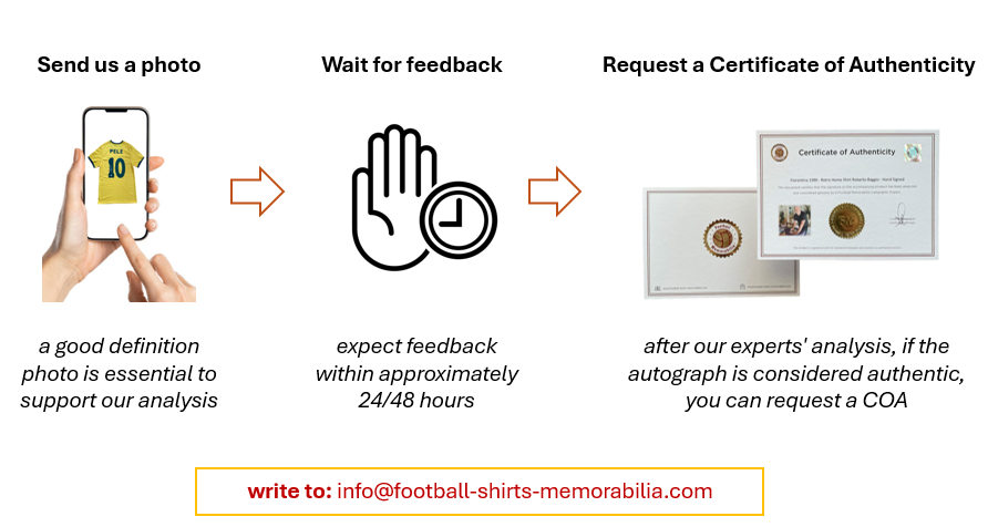 If your autograph is deemed authentic, you can request a COA-Certificate of Authenticity , which will be shipped with a double numbered hologram and will be uploaded to our permanent archive, which you can consult online at www.football-shirts-memorabilia.com